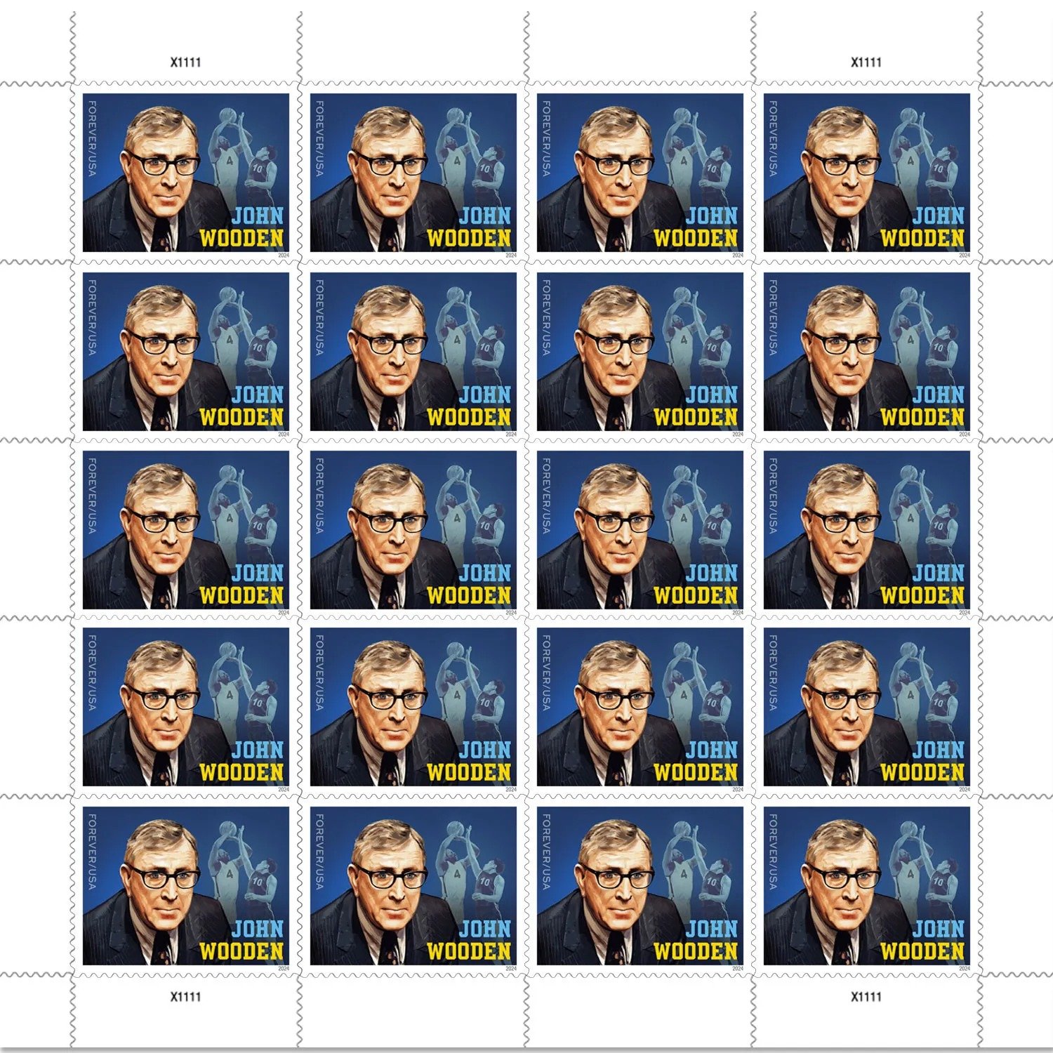 The John Wooden stamp is being issued as a Forever® stamp in a pane of 20. This Forever stamp will always be equal in value to the current First-Class Mail® one-ounce rate.